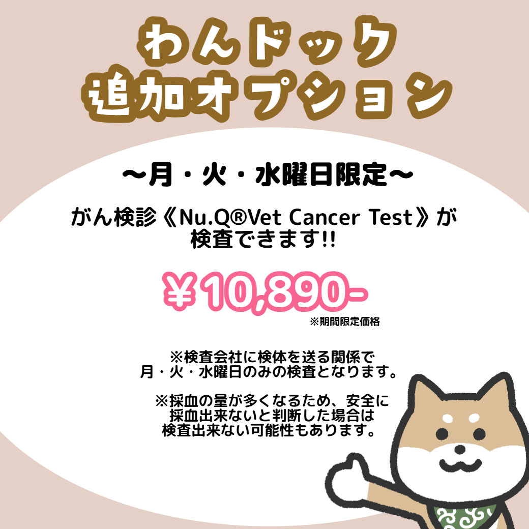 また、月・火・水曜日限定でがん検診《Nu.Q® Vet Cancer Test》をオプションでつけられます!