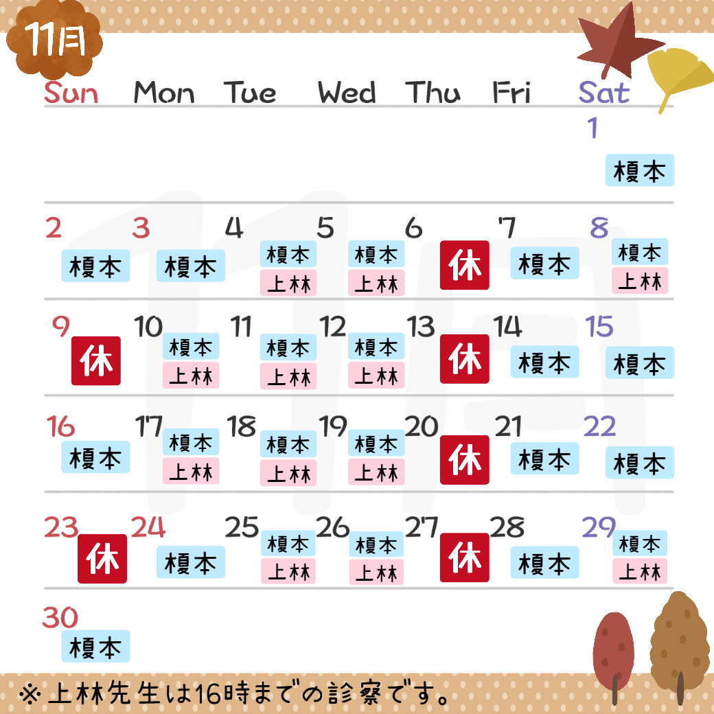 11月の診察日は下記の診療日カレンダーの通りになっております🏥